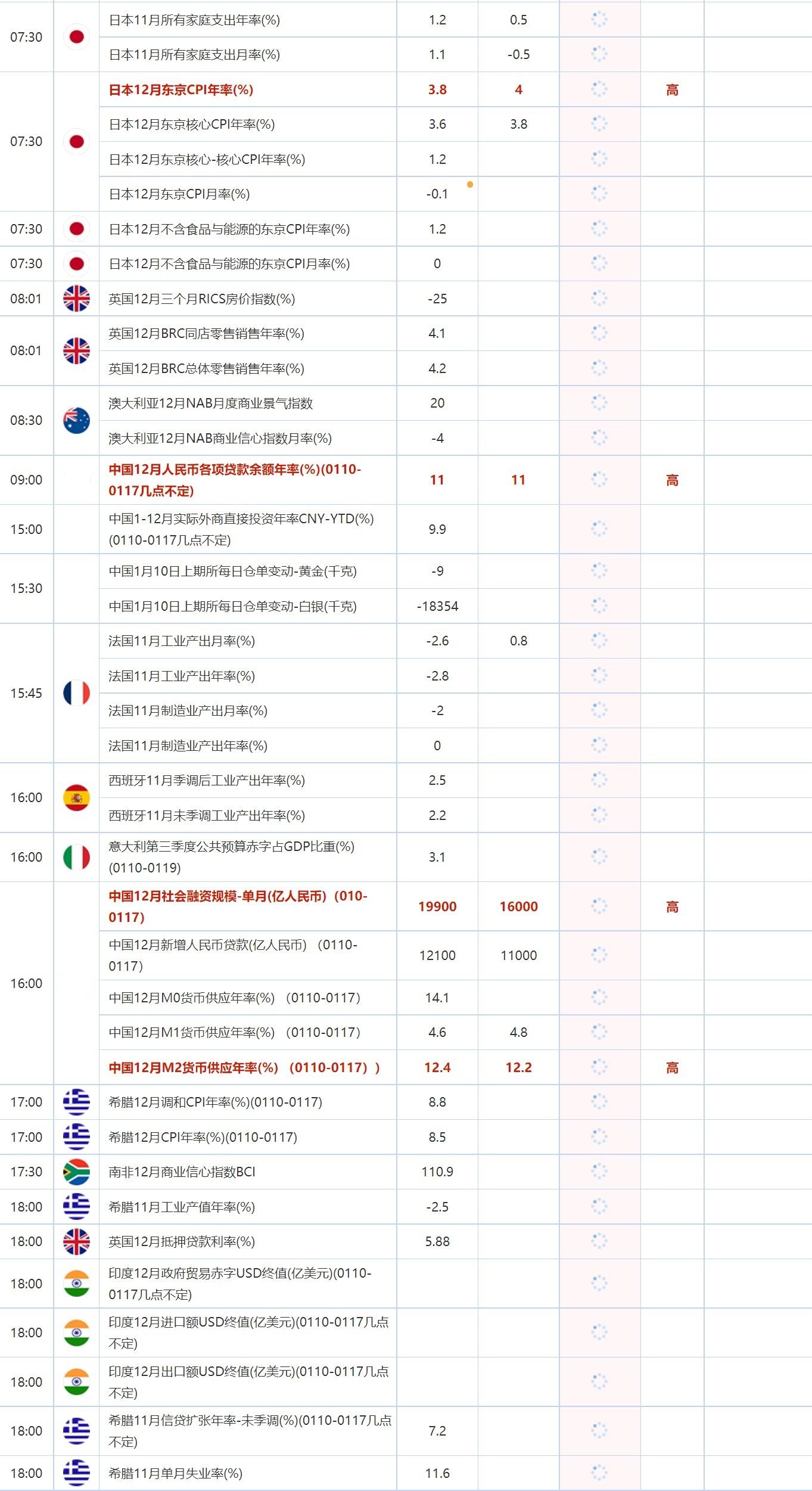09:00 中国12月人民币各项贷款余额年率(%)(0110-0117几点不定) , 前值 11 , 预期值 11 , 公布值:待发布