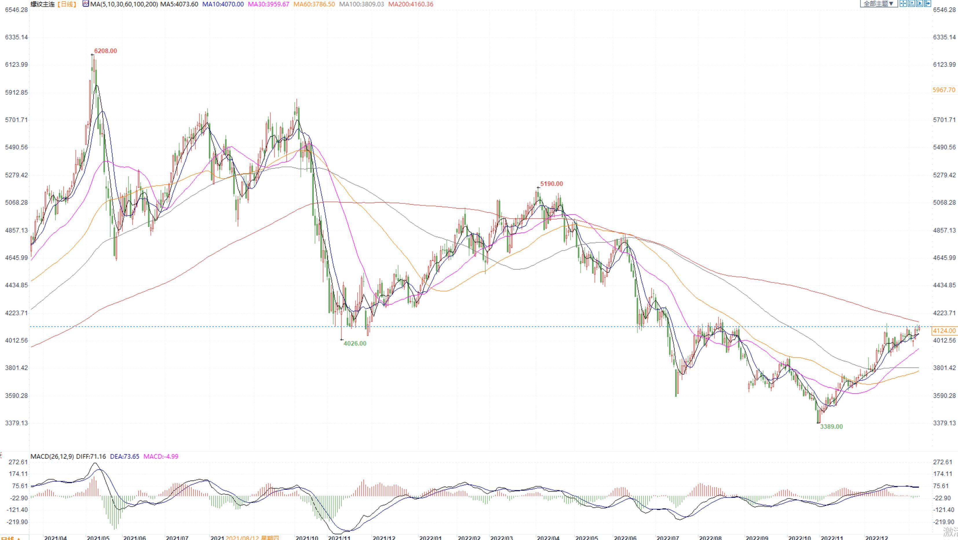 价格:螺纹钢2305合约夜盘窄幅震荡,今日白天再次出现上行。收盘价4124元/吨,收涨0.59%。上海中天现货价4120元/吨,现货价格在高位继续持稳。