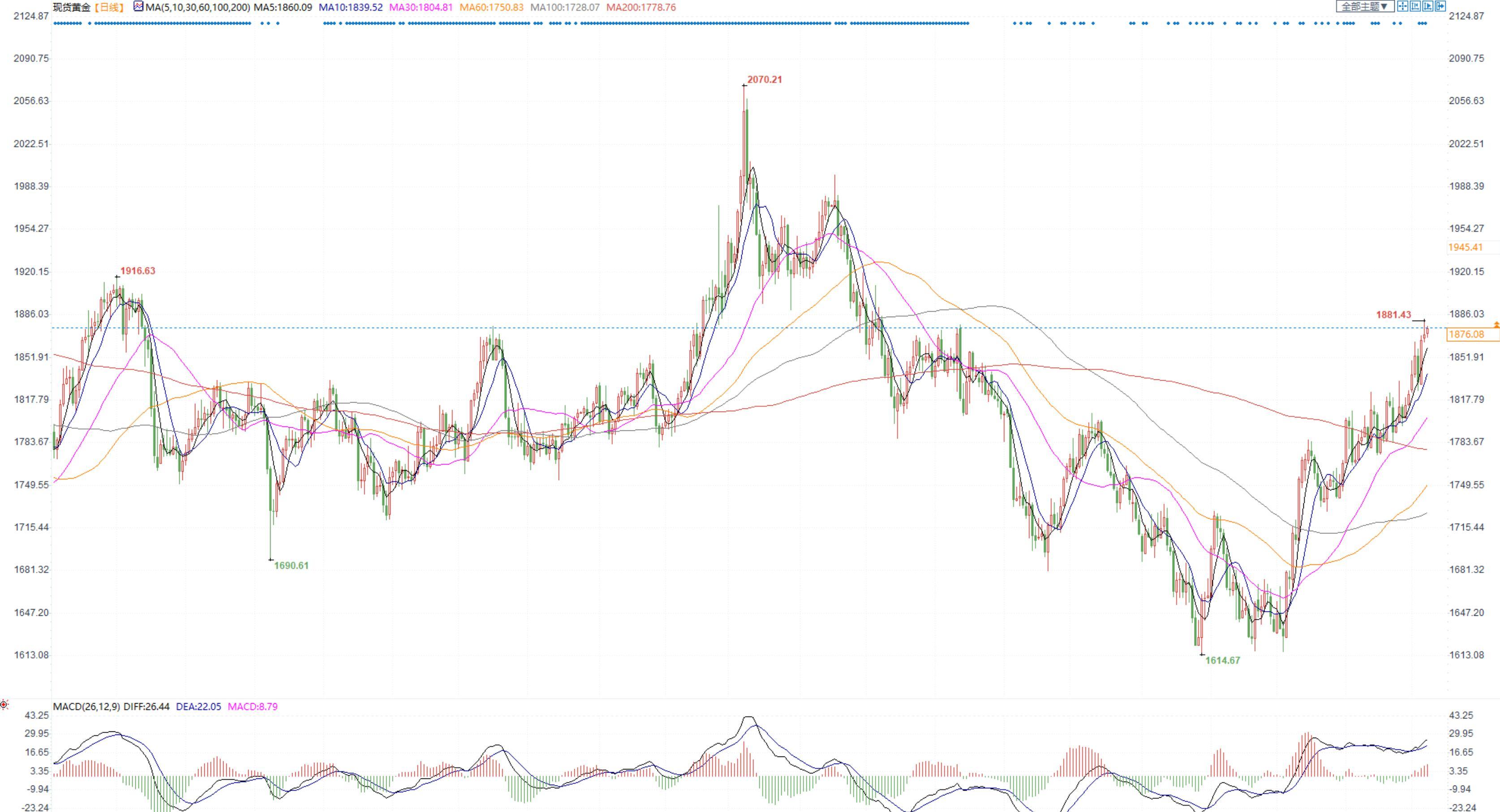 【今日行情】金银涨跌互现。AU2304收盘价为413.70,收涨0.34%;AG2302收盘价为5183收跌0.63%。隔夜美元指数一度跌破103,十年期美债收益率继续下挫,降至3.5%附近,两大指标均不同程度走弱,对金银支撑增强。