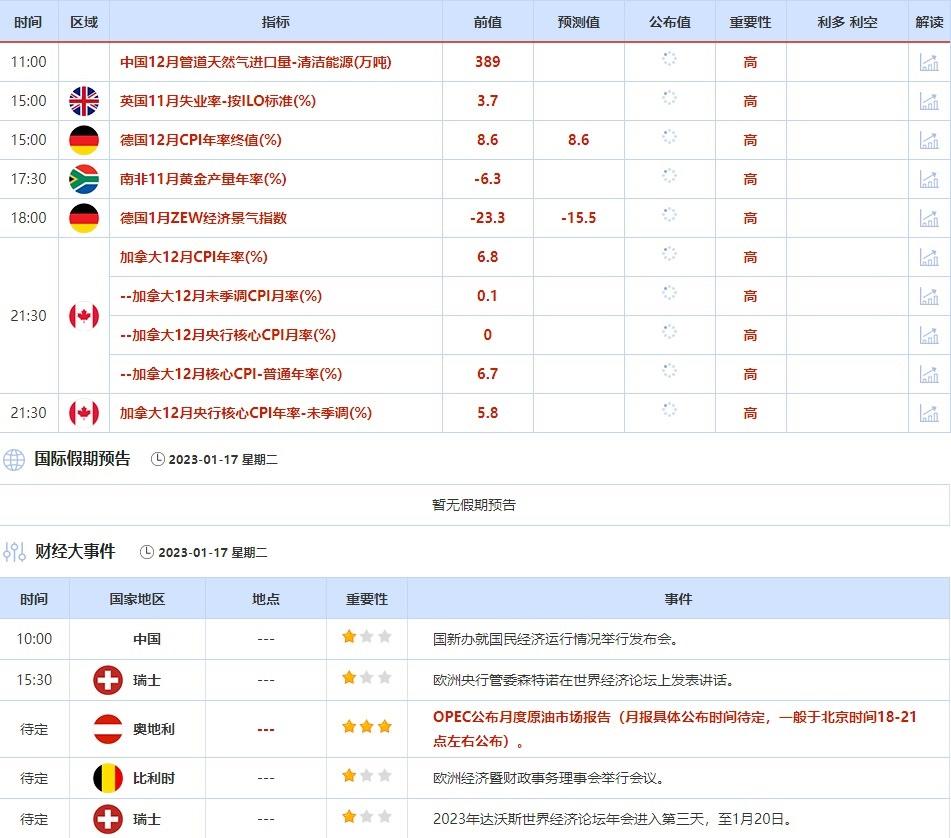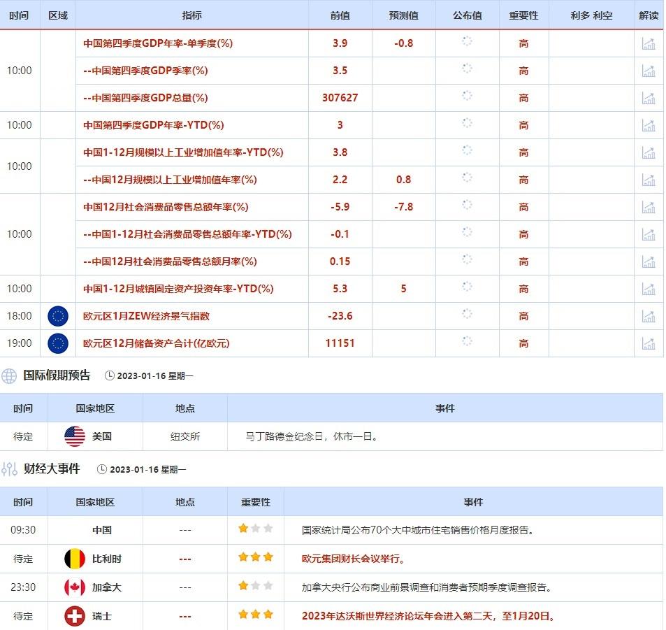 1月16日需要关注的大事是欧元集团财长会议的举行,相关政策或影响走势。2023年达沃斯世界经济论坛年会进入第二天。此外,当天美国纽交所因马丁路德金纪念日,休市一日,投资者也需保持关注。