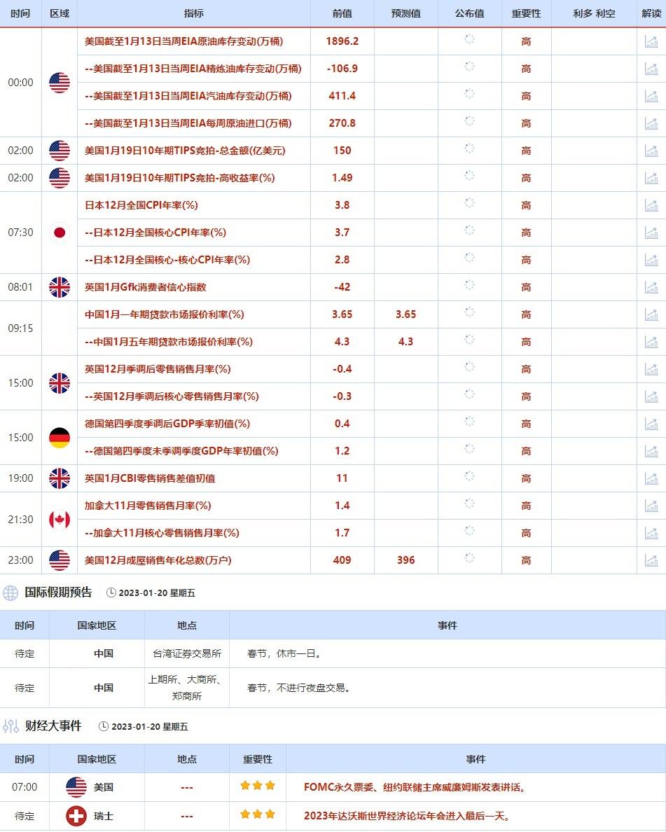 1月20日,FOMC永久票委、纽约联储主席威廉姆斯发表讲话,2023年达沃斯世界经济论坛年会进入最后一天,投资者也需保持关注。