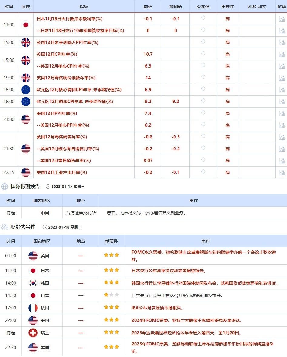 1月18日当天,纽约联储主席威廉姆斯, 亚特兰大联储主席博斯蒂克和圣路易斯联储主席布拉德将发表讲话,IEA公布月度原油市场报告,都可能影响市场走势,也需引起重视。