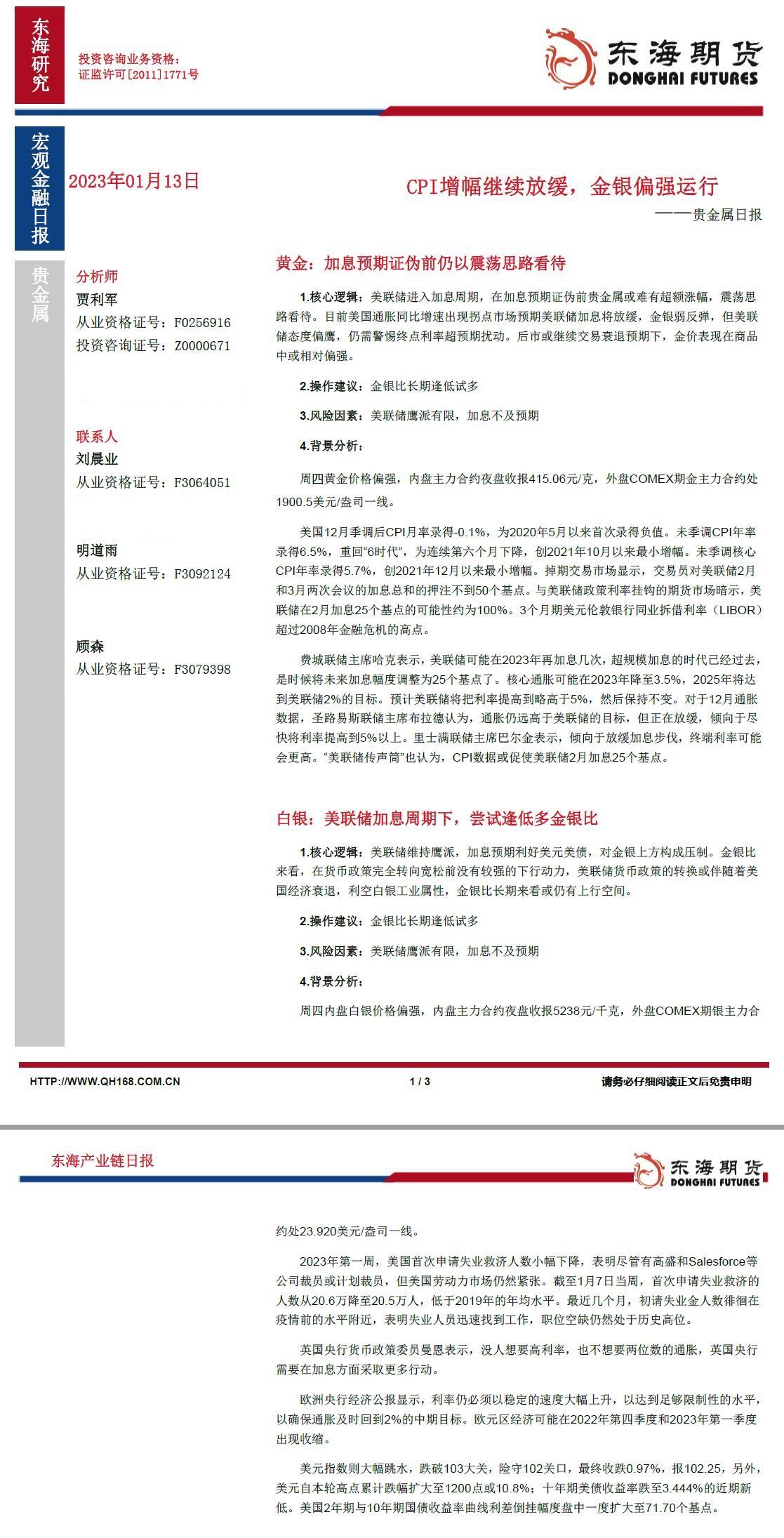 标题: 【东海期货1月13日产业链日报】贵金属篇:CPI增幅继续放缓,金银偏强运行
