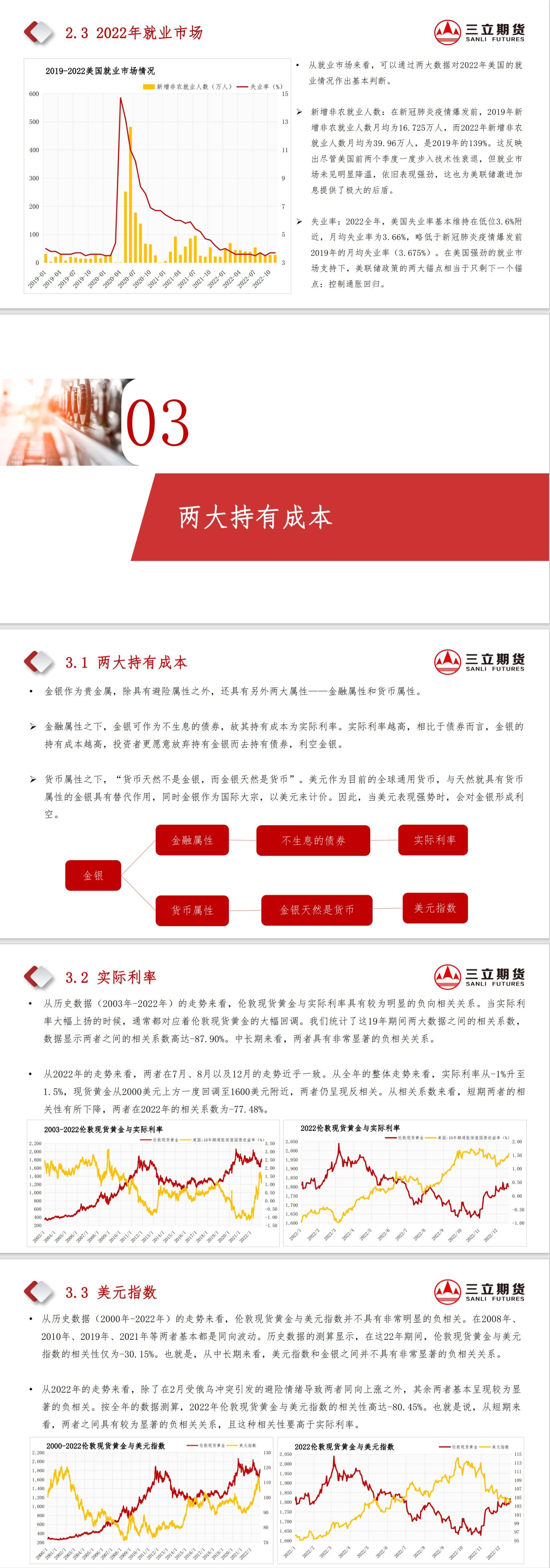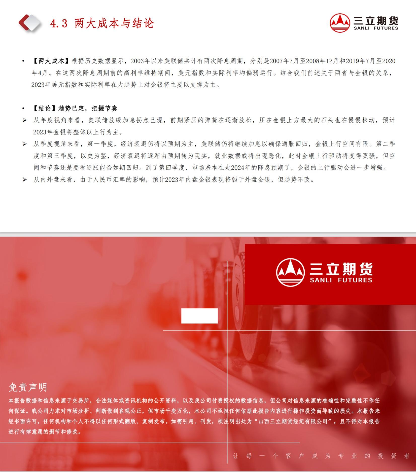 从季度视角来看,第一季度,经济衰退仍将以预期为主,美联储仍将继续加息以确保通胀回归,金银上行空间有限。第二季度和第三季度,以史为鉴,经济衰退将逐渐由预期转为现实,就业数据或将出现恶化,此时金银上行驱动将变得更强,但空间和节奏还是要看通胀能否如期回归。到了第四季度,市场基本在走2024年的降息预期了,金银的上行驱动会进一步增强。