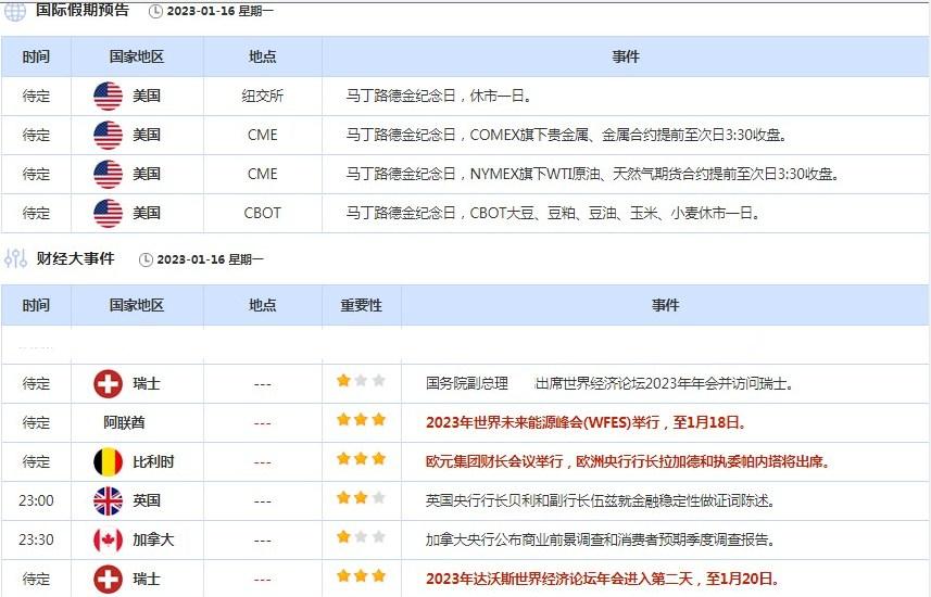 周一是马丁路德金纪念日,无重要经济数据出炉。美国股市休市,黄金、原油、天然气期货会提前休市,农产品期货休市。