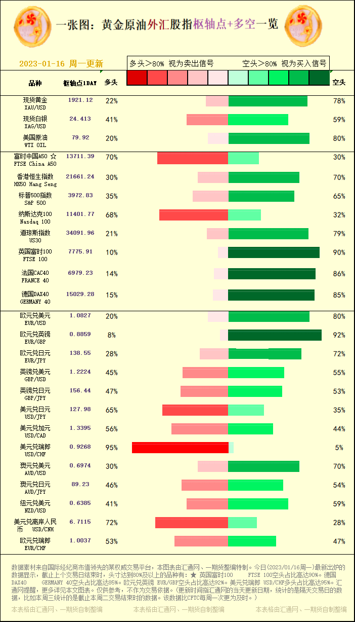 汇通财经APP讯——一张图:黄金原油外汇股指"枢纽点+多空占比"一览。今日(2023/01/16周一)最新出炉的数据显示,截止上个交易日结束时,头寸达到80%及以上的品种有:★ 英国富时100 FTSE 100空头占比高达90%。德国DAX40 GERMANY 40空头占比高达85%。欧元兑英镑 EUR/GBP空头占比高达92%。美元兑瑞郎 USD/CHF多头占比高达95%。汇通网提醒,更多详见本文图表。仅供参考,不作为交易依据。