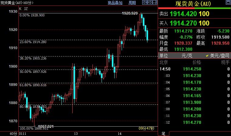 北京时间19:55,现货黄金下跌0.16%至1916.95美元/盎司;COMEX期金主力合约下跌0.09%至1920.0美元/盎司;美元指数上涨0.10%至102.281。