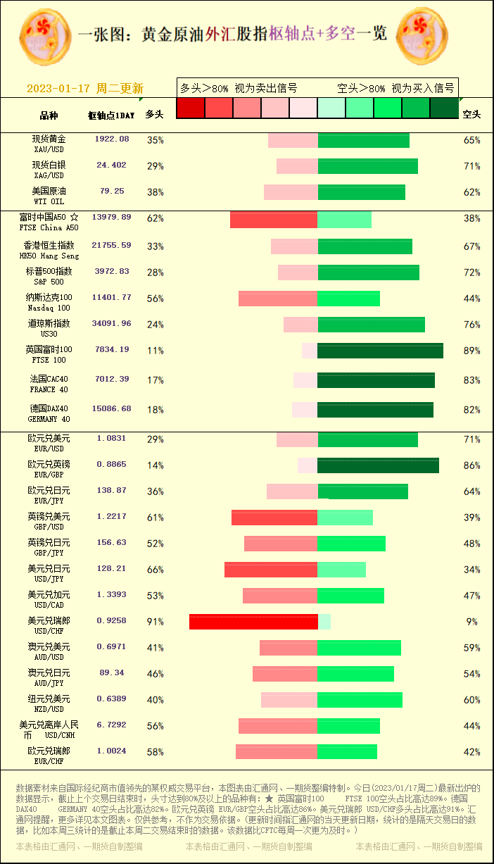 汇通财经APP讯——一张图:黄金原油外汇股指"枢纽点+多空占比"一览。今日(2023/01/17周二)最新出炉的数据显示,截止上个交易日结束时,头寸达到80%及以上的品种有:★ 英国富时100 FTSE 100空头占比高达89%。德国DAX40 GERMANY 40空头占比高达82%。欧元兑英镑 EUR/GBP空头占比高达86%。美元兑瑞郎 USD/CHF多头占比高达91%。汇通网提醒,更多详见本文图表。仅供参考,不作为交易依据。