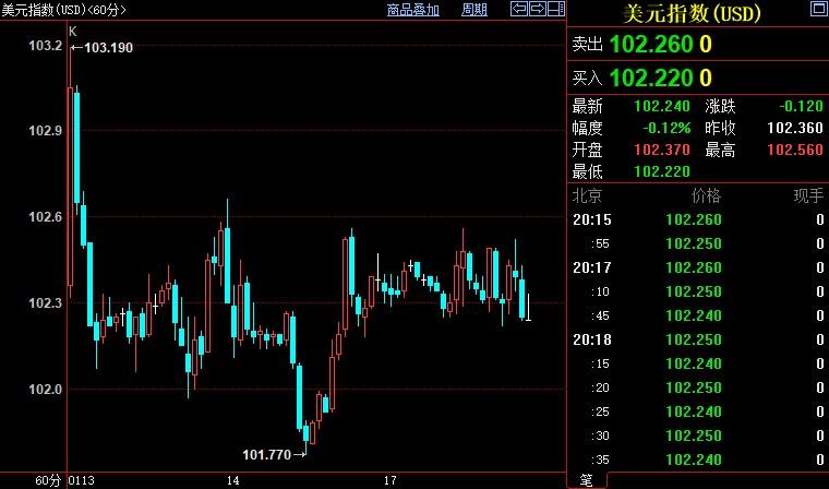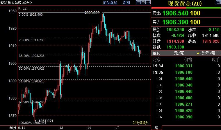 北京时间20:18,现货黄金下跌0.34%至1912.73美元/盎司;COMEX期金主力合约下跌0.31%至1915.8美元/盎司;美元指数下跌0.11%至102.248。