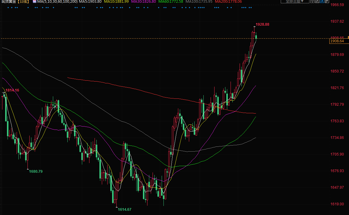 金价周二回落,上一交易日创下八个多月高点,因人们希望美联储今后将采取不太激进的加息方式;现货金下跌0.7%,至每盎司1904.87美元,周一曾创下4月底以来的最高价。