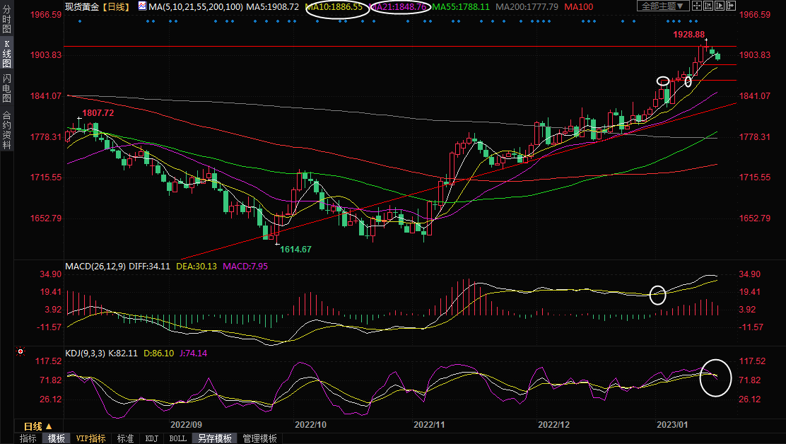 日线级别:单边上涨后回调;KDJ高位死叉,K线高位十字星后,金价持续走弱,留意10日均线1886.40附近支撑,若失守该支撑,则增加短线见顶信号;进一步支撑在6月13日高点1878.65附近,1月11日高点支撑在1867.04附近,强支撑在21日均线1848.70附近,该位置的得失可以作为中线走势的参考。