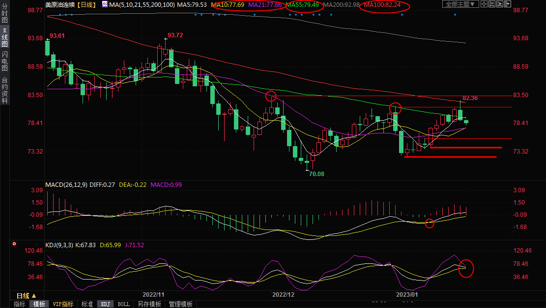 日线级别:震荡;上一交易日油价受到布林线上轨(81.82)和100日均线(82.24)阻力压制后回落,KDJ有拐头死叉的趋势,且油价录得长上影线阴线,回落至55日均线79.49下方下方,油价短线看空信号显著增强,留意10日均线77.69附近支撑,21日均线支撑也在该位置附近,如果失守该支撑,则油价可能会重新跌向70关口附近。