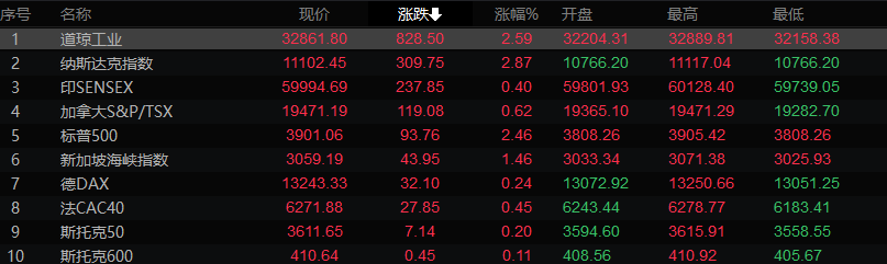 美股收盘情况:道琼斯工业指数上涨2.59%,至32861.8点;标普500指数攀升2.46%,至3901.06点;纳斯达克指数大涨2.87%,至11102.45点。