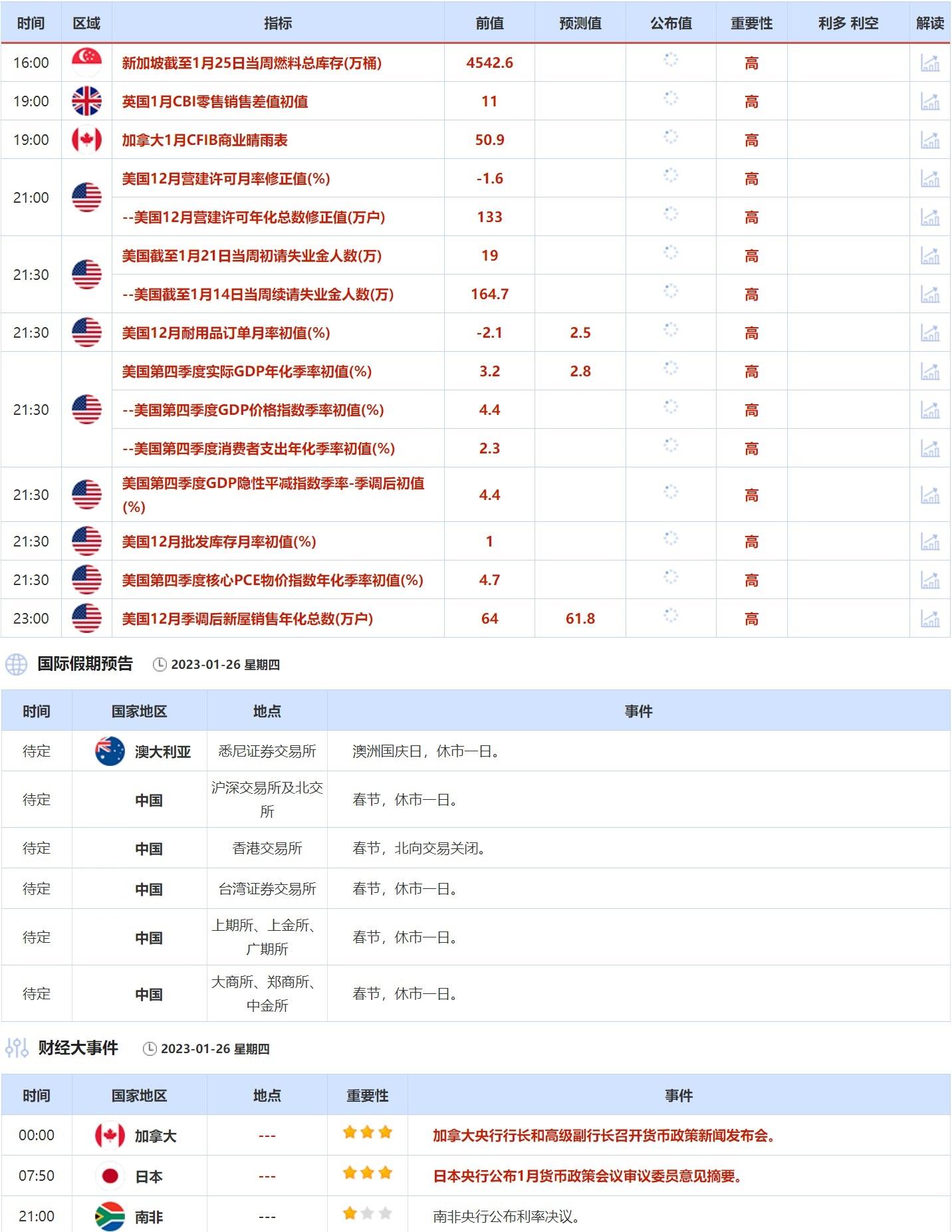 1月26日当天,加拿大央行行长和高级副行长召开货币政策新闻发布会。此外,日本央行公布1月货币政策会议审议委员意见摘要。这两件大事也许引起投资者重视。