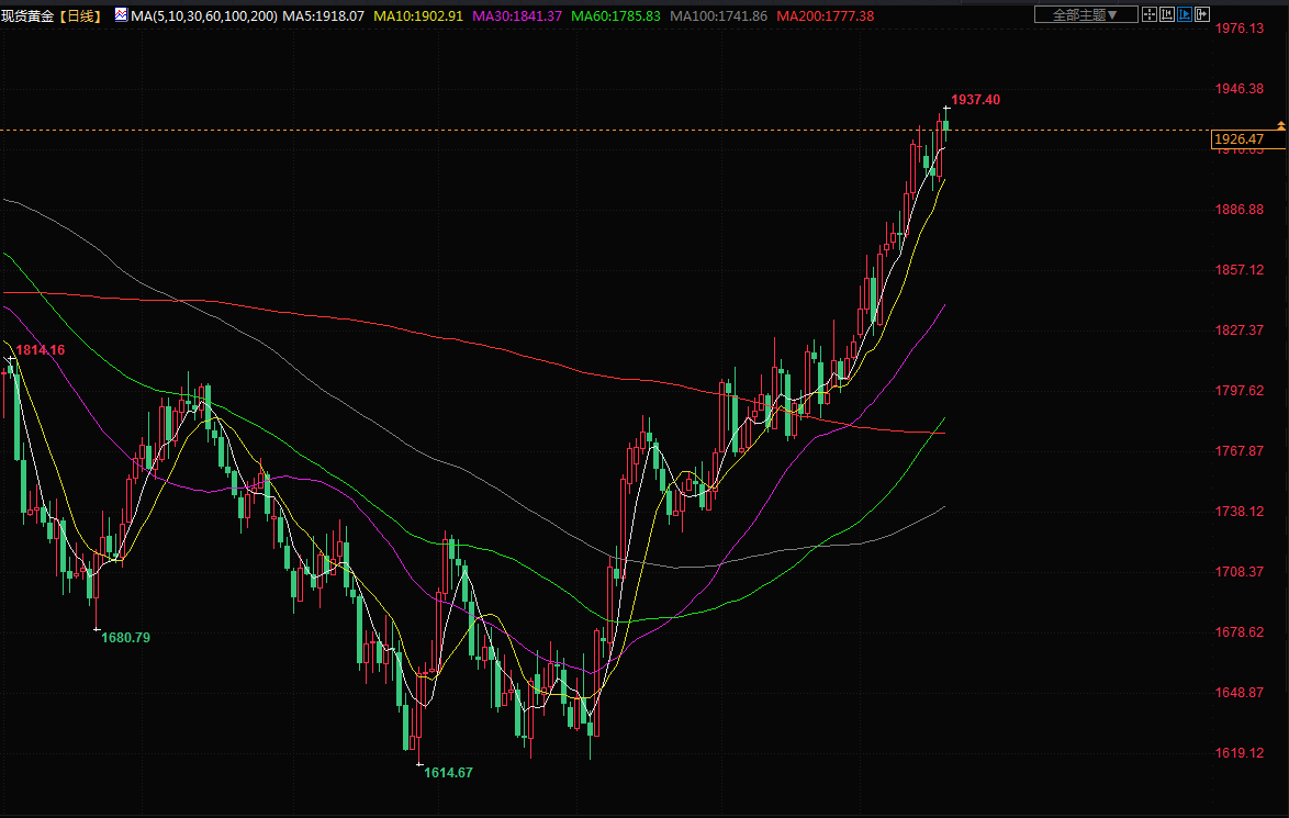 金价周五下跌,美元走强,不过,金价周线仍连续第五周上涨,受助于美联储放缓步伐加息的希望。现货金下跌0.2%,至每盎司1928.06美元,盘中稍早一度触及4月22日以来最高的1937.49美元。本周迄今,现货金已涨0.4%。