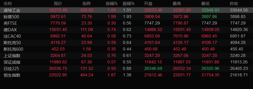 美股收盘情况:道琼斯工业指数上涨1%,至33375.49点;标普500指数上涨1.89%,至3972.61点;纳斯达克指数上涨2.66%,至11140.43点。