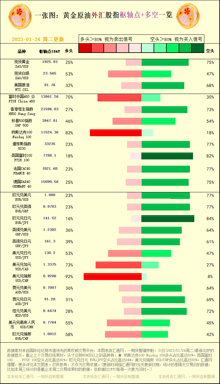 汇通财经APP讯——一张图:黄金原油外汇股指"枢纽点+多空占比"一览。今日(2023/01/24周二)最新出炉的数据显示,截止上个交易日结束时,头寸达到80%及以上的品种有:★ 纳斯达克100 Nasdaq 100多头占比高达82%。英国富时100 FTSE 100空头占比高达82%。欧元兑日元 EUR/JPY空头占比高达84%。美元兑瑞郎 USD/CHF多头占比高达92%。汇通网提醒,更多详见本文图表。仅供参考,不作为交易依据。