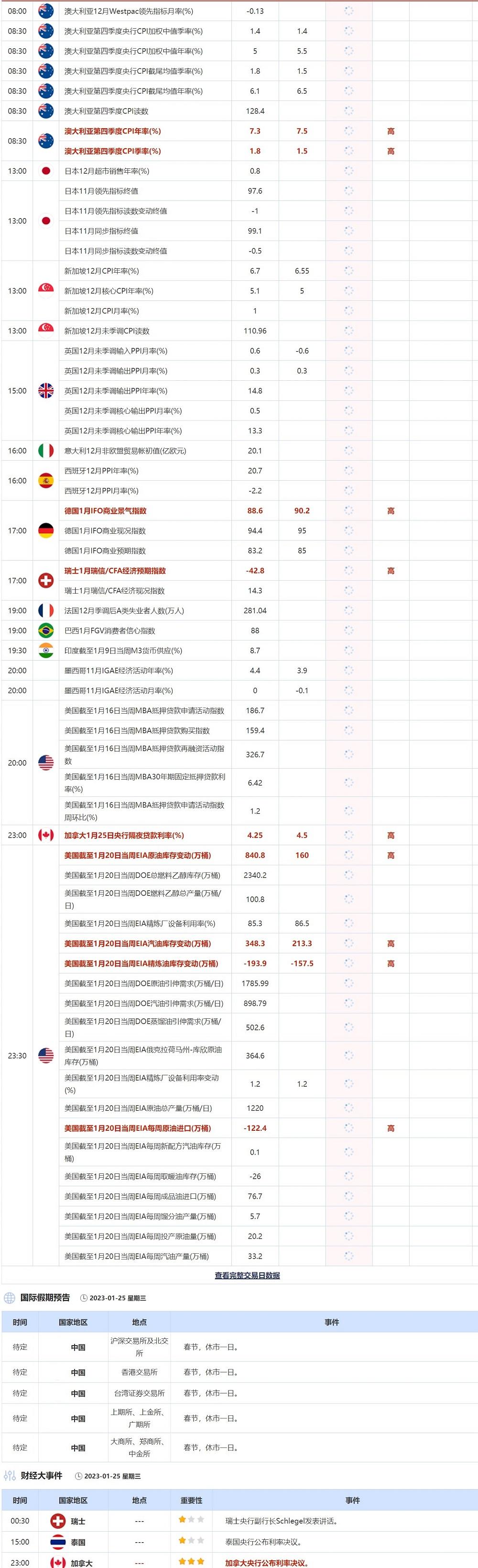 汇通财经APP讯——1月25日,投资者需要关注的重点数据:澳大利亚第四季度CPI年率,澳大利亚第四季度CPI季率,德国1月IFO商业景气指数,美国截至1月20日当周EIA原油库存变动,美国截至1月20日当周EIA汽油库存变动和美国截至1月20日当周EIA精炼油库存变动。当天需要关注加拿大央行公布利率决议,以及中国各大交易所的春节假期休市公告。