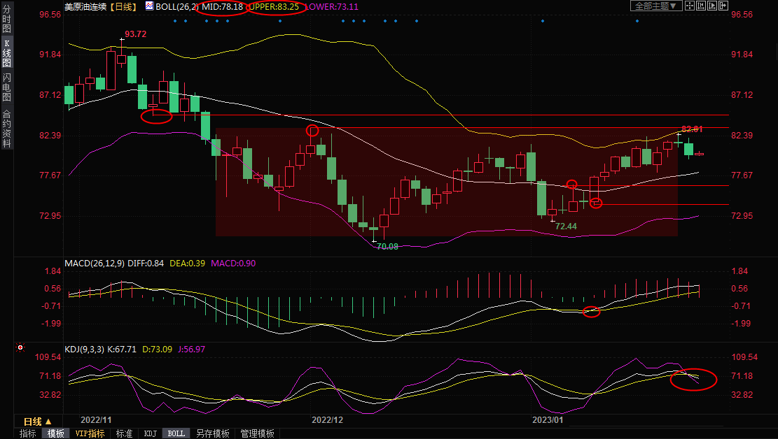 日线级别:震荡;油价周一未能顶破近两个月的震荡区间,并在箱体顶部区域录得十字星K线,周二紧跟中阴线,基本宣告油价后市维持宽幅震荡走势。KDJ重新结成死叉,暗示油价短线偏向空头,可能会在中线重新震荡跌向箱体底部70整数关口附近;短线的话,初步支撑在周二低点79.64附近,布林线中轨支撑在78.17附近,如果失守该支撑,则增加短线看空信号。进一步支撑在1月9日高点76.71附近。
