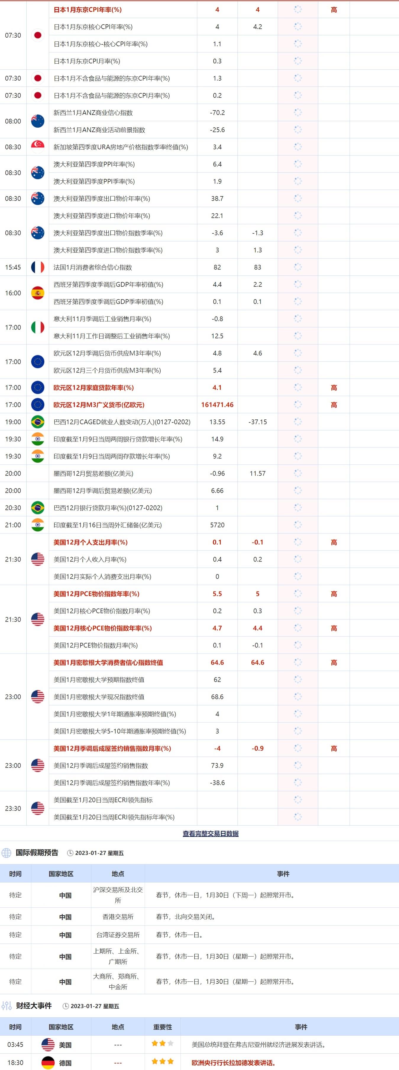 汇通财经APP讯——1月27日,投资者需要关注的重点数据:日本1月东京CPI年率,欧元区12月M3广义货币 ,欧元区12月家庭贷款年率,美国12月个人支出月率,美国12月PCE物价指数年率,美国12月核心PCE物价指数年率,美国12月季调后成屋签约销售指数月率和美国1月密歇根大学消费者信心指数终值。需要关注的大事件包括欧洲央行行长拉加德发表讲话,中国各大交易所的春节假期休市公告。