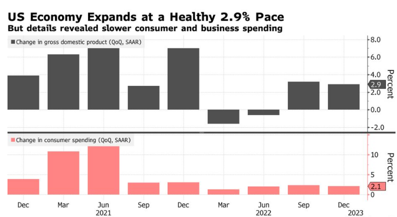 数据显示,美国第四季度GDP环比增长年率为2.9%,第三季度为3.2%,经济学家之前预测为2.6%
