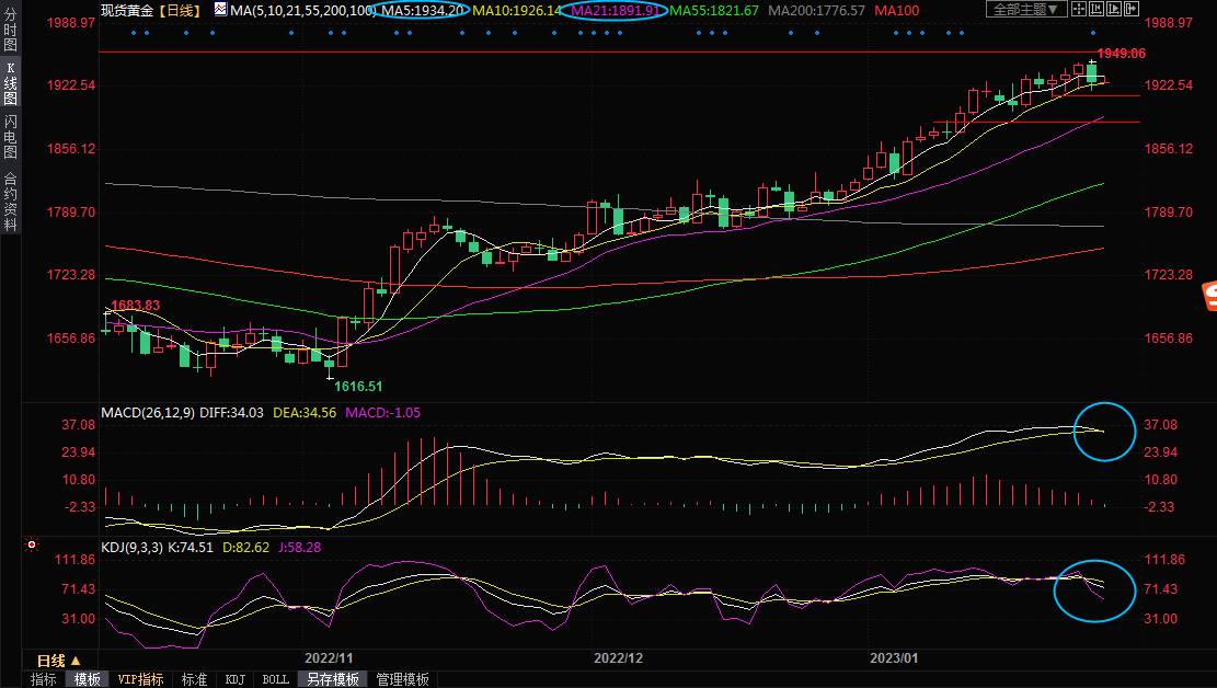 技术面来看,日线级别,金价在高位出现一阴吞多阳的K线组合,而且MACD初步死叉,KDJ死叉,金价短线面临的见顶风险显著增加,投资者需要予以警惕。