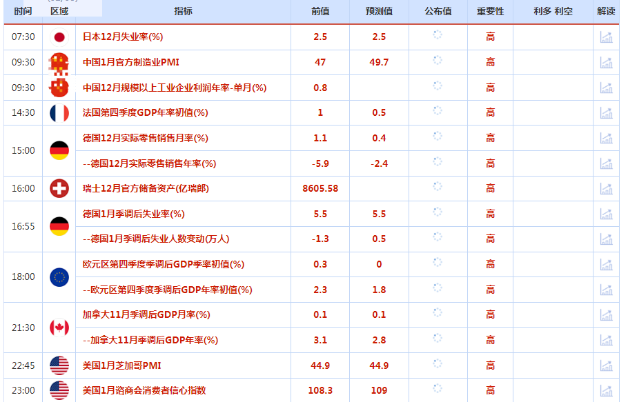 汇通财经APP讯——1月31日(周二),美元周一上涨,美联储即将开始为期两天的政策会议。欧元受到提振,因通胀数据高于预期,欧洲央行将在周四召开会议;金价在震荡交投中小幅下跌,投资者将目光投向本周的美联储政策会议,预期加息步伐将进一步放缓;油价延续跌势,主要央行即将加息,这将打击需求,且俄罗斯出口依然强劲。