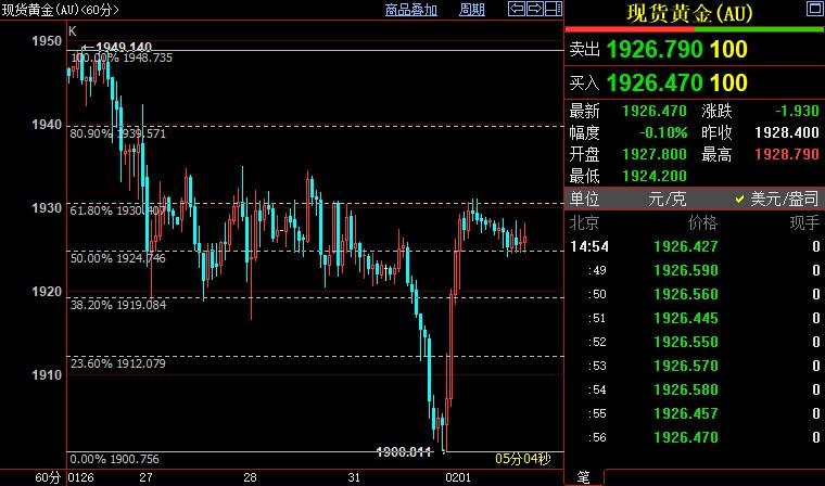 北京时间14:56,现货黄金下沉0.08%至1926.67美元/盎司;COMEX期金主力合约下跌0.16%至1942.2美元/盎司;美元指数下沉0.03%至102.073。