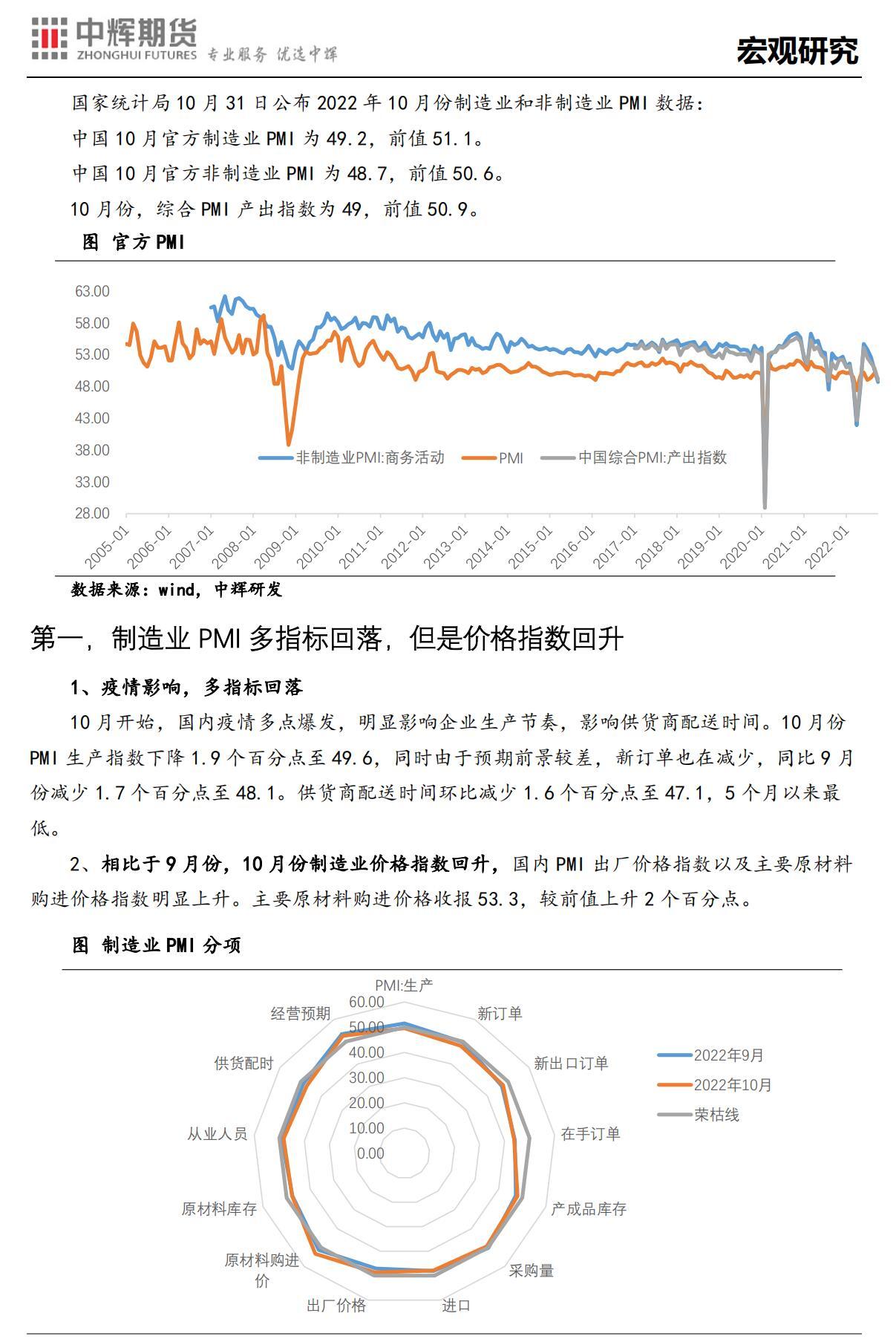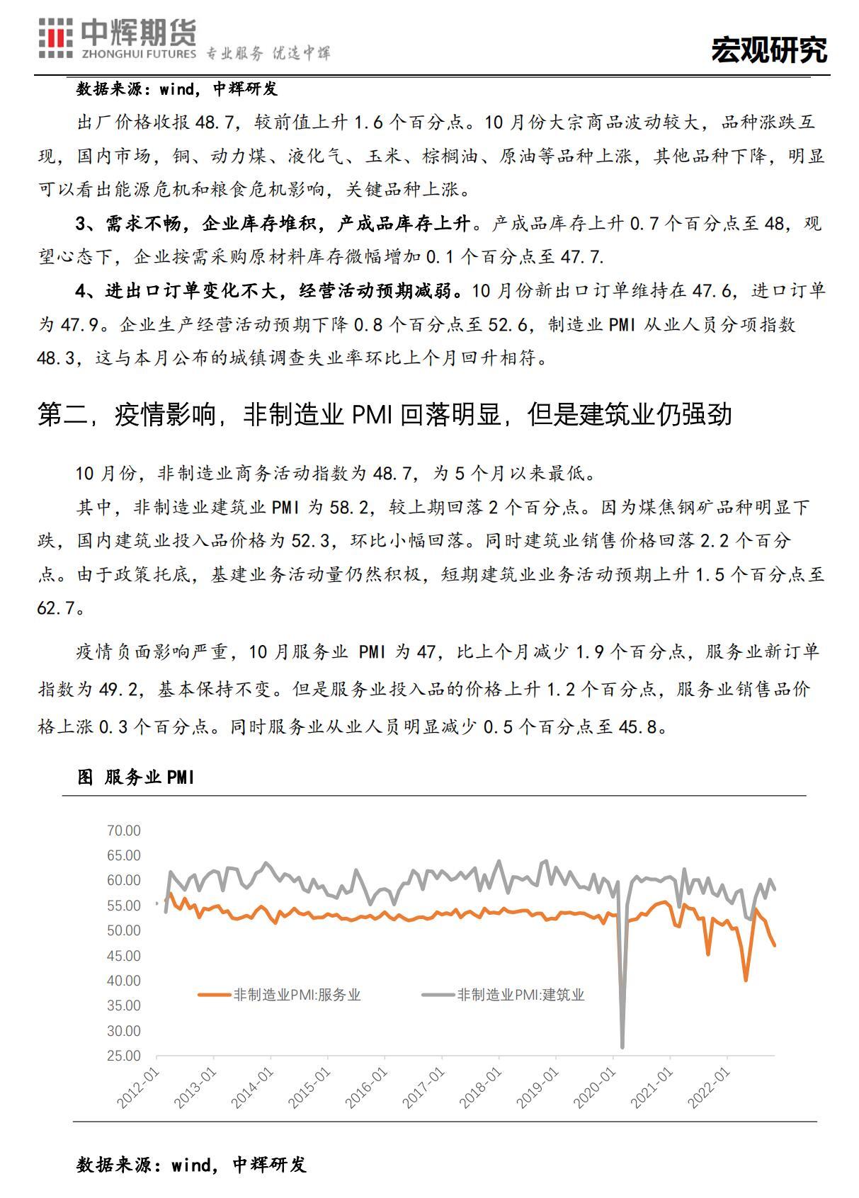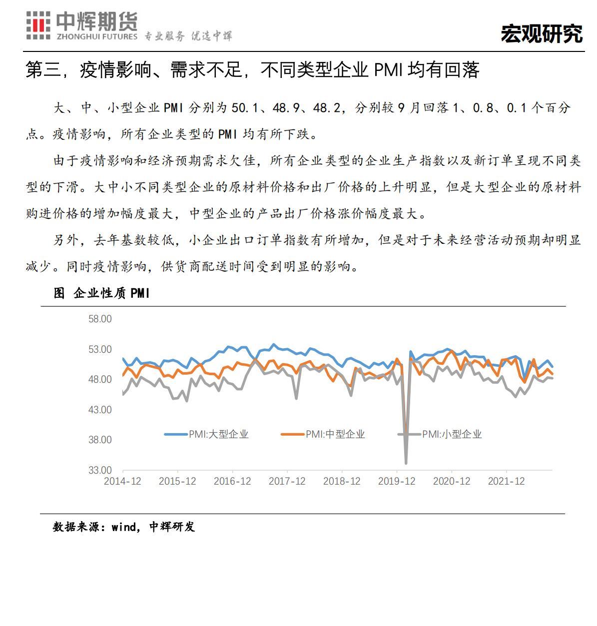 第一,疫情影响,生产订单下降,价格指数上涨 10 月份国内多点疫情爆发,再加上需求较弱影响,企业生产和订单指数均呈现不同程度的下滑,但是由于原油、燃气、动力煤等能源价格的上涨,以及个别品种供给端问题影响,原材料购进价格和出厂价格出现上涨。物流不畅和需求下滑,企业库存堆积,制造业生产经营活动预期减弱。第二,疫情影响,服务业 PMI 明显回落 疫情影响,国内非制造业 PMI 有下滑,但是 10 月份的基建活动仍然维持在 58.2,建筑行业业务活动预期增加值 64.2。明显的疫情和严格防控贯穿 10 月份全月,对场景消费影响最大,服务业业务活动预期较上个月下降 1.9个百分点至 47。第三,所有类型企业均下滑,小企业尤甚 由于疫情影响和经济预期需求欠佳,所有企业类型的企业生产指数以及新订单呈现不同类型的下滑。另外,去年基数较低,小企业出口订单指数有所增加,但是对于未来经营活动预期却明显减少。同时疫情影响,供货商配送时间受到明显的影响。第四,展望-增量政策的出台或对 PMI 有刺激,服务业关注疫情 目前市场信心尚有不足,大会结束,政策重心将转移到全力以赴促进经济发展上来,如果有相关增量政策继续落地,则高端制造业 PMI 将继续强劲,整体制造业 PMI 或上行。服务业 PMI 仍然有赖于疫情的防控。风险提示:海外性收紧超预期;经济下行超预期;疫情全面爆发
