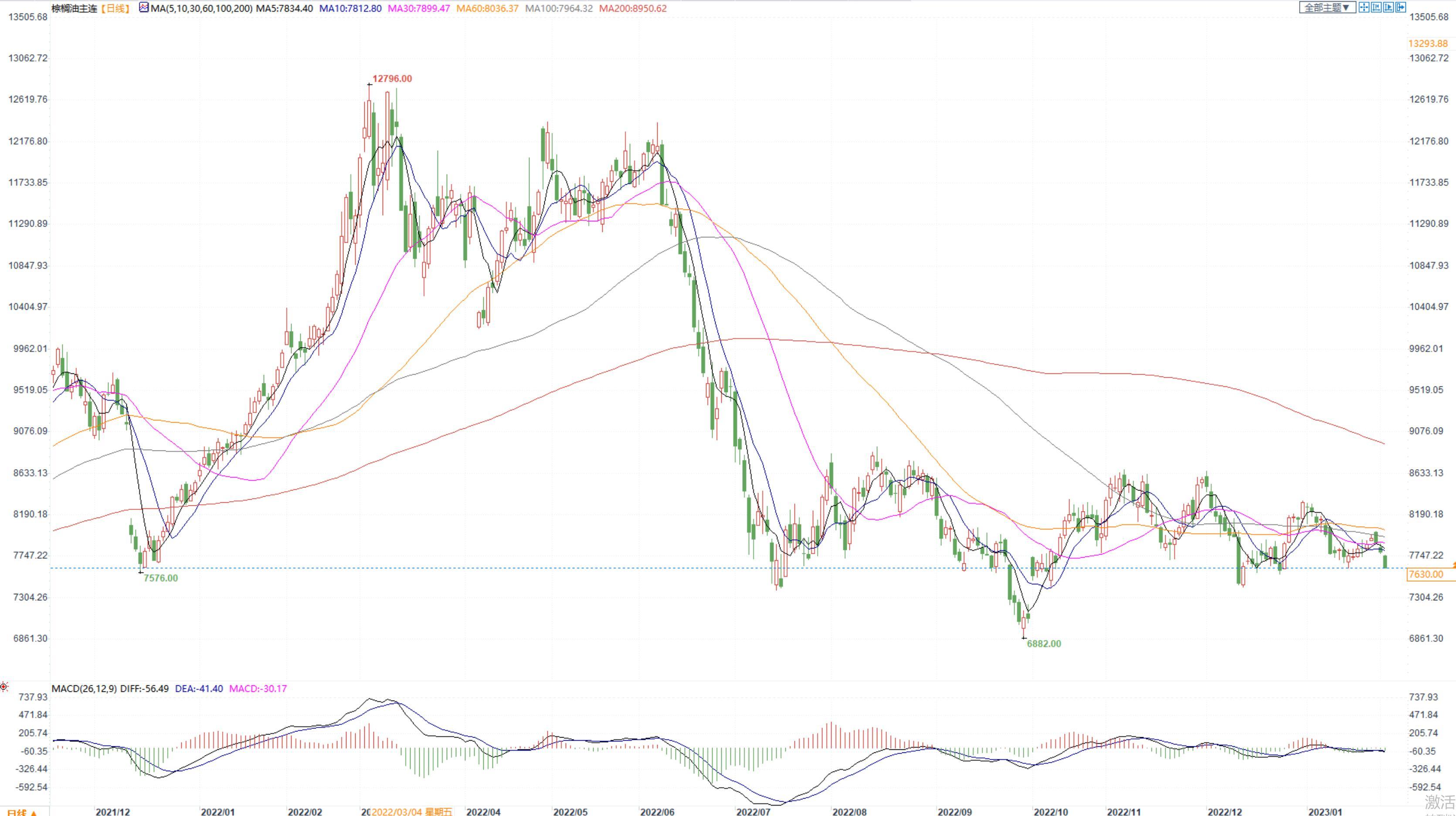 棕榈油2305合约日内跌2.25%,收盘7656元/吨,广州市场棕榈油7580元/吨。