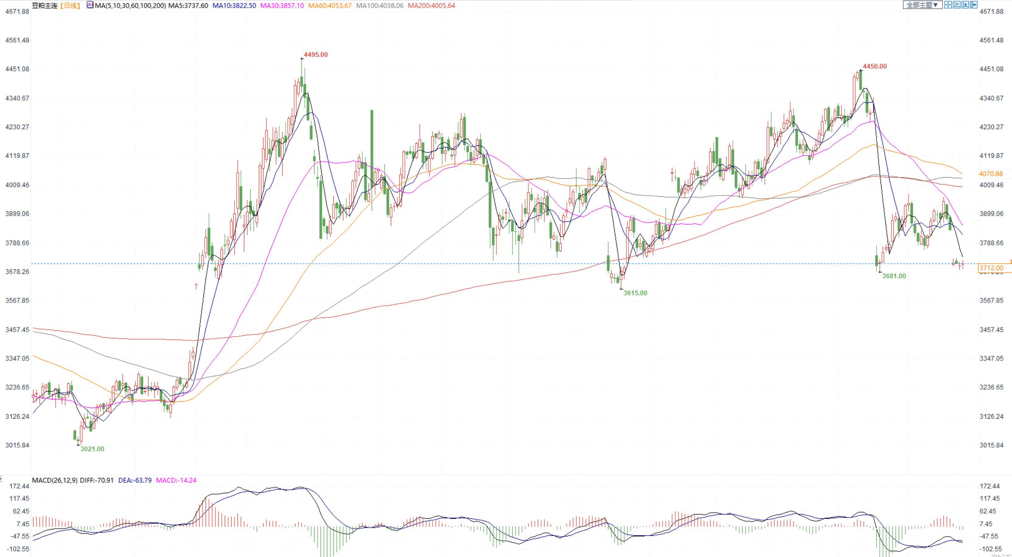 豆粕2305合约日内跌0.21%,收盘价38760元/吨,张家港市场豆粕4590元/吨。