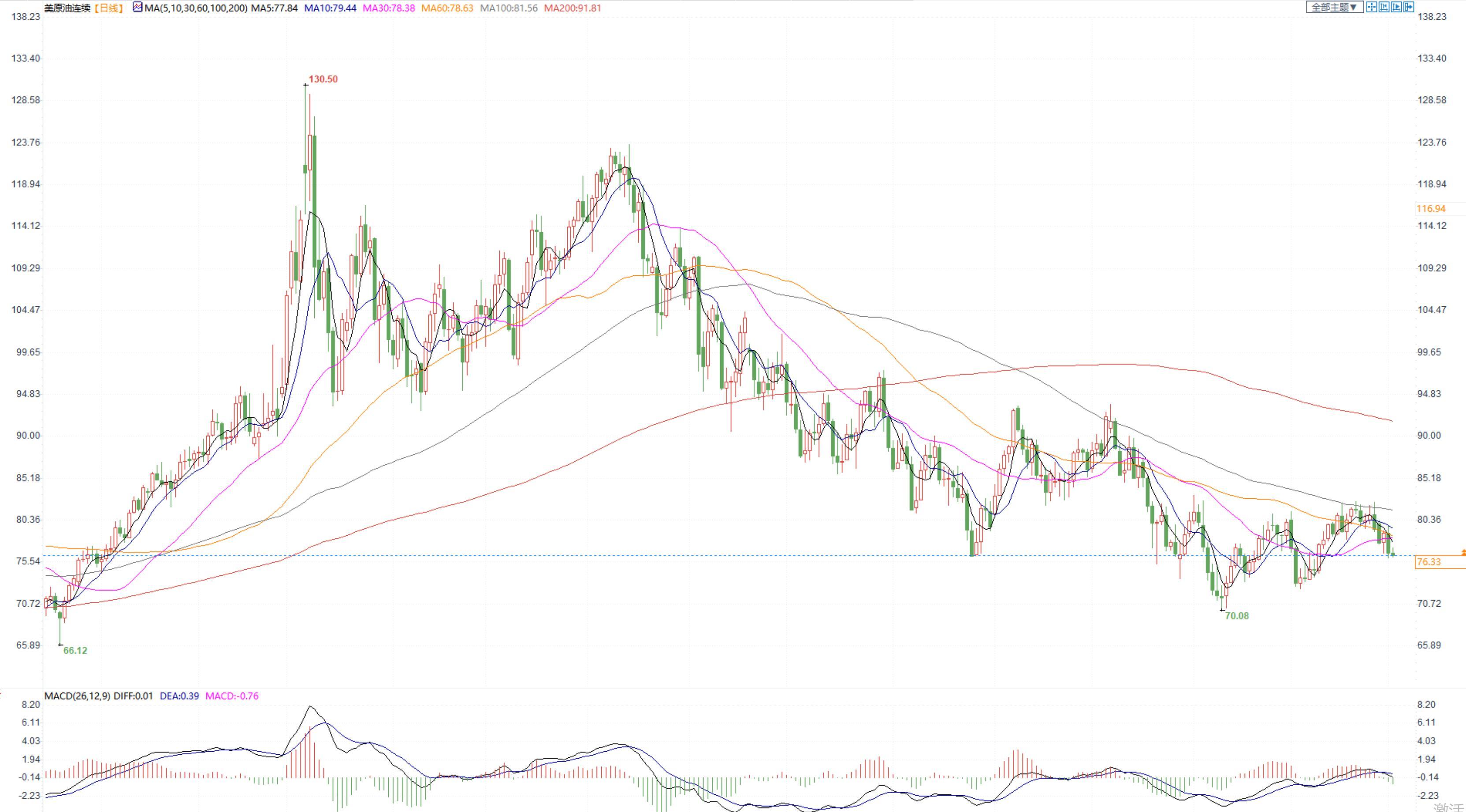 期货市场,布油在83美元整数关口附近震荡整理,5日均线下穿20日均线,关注40日均线附近的支撑情况。国内SC2303合约跌超3%,收盘价534.2。