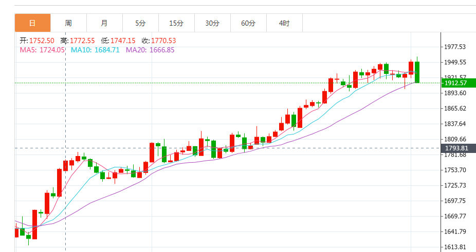 金价周四下跌近2%,美元反弹,且在黄金因美联储主席鲍威尔的鸽派发言而攀升至九个月高位后,一些投资者获利了结。现货金下跌1.8%,至每盎司1915.79美元,稍早曾触及2022年4月以来最高。