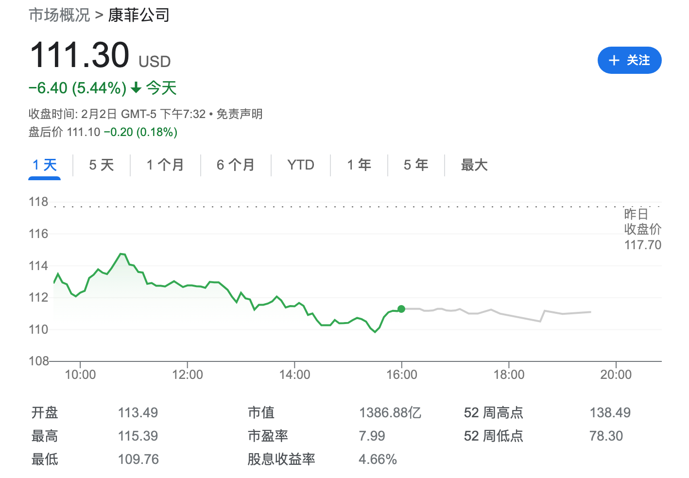 不过,受当日油价下跌以及第四季度利润不及预期影响,康菲石油股价周四下跌逾5%,收报111.3美元。