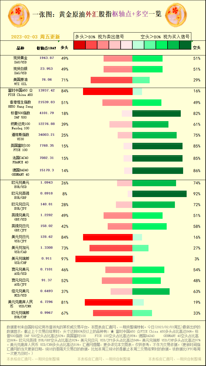 汇通财经APP讯——一张图:黄金原油外汇股指"枢纽点+多空占比"一览。今日(2023/02/03周五)最新出炉的数据显示,截止上个交易日结束时,头寸达到80%及以上的品种有:★ 富时中国A50 ☆FTSE China A50多头占比高达84%。标普500指数 S&P 500空头占比高达82%。英国富时100 FTSE 100空头占比高达85%。德国DAX40GERMANY 40空头占比高达86%。欧元兑英镑 EUR/GBP空头占比高达92%。美元兑日元 USD/JPY多头占比高达84%。美元兑瑞郎 USD/CHF多头占比高达97%。美元兑离岸人民币 USD/CNH多头占比高达81%。汇通网提醒,更多详见本文图表。仅供参考,不作为交易依据。