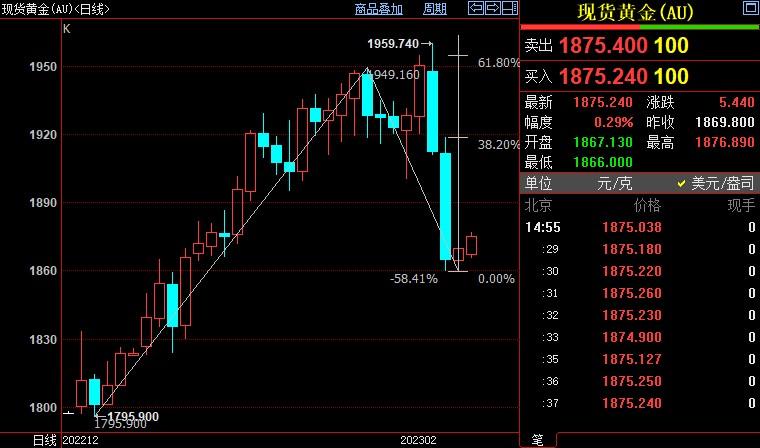 北京时间20:14,现货黄金上涨0.14%至1869.83美元/盎司;COMEX期金主力合约上涨0.15%至1882.3美元/盎司;美元指数上浮0.06%至103.692,盘中再创1月9日以来新高至103.801。