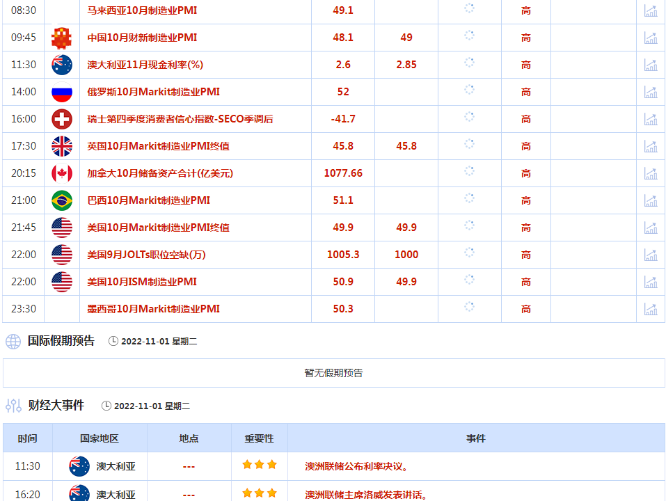 北京时间周二(11月1日)亚市早盘,美元指数交投于111.56附近;美元周一全线上涨,收复10月稍早的部分失地,因预期本周美联储召开货币政策会议时将再次大幅加息;金价下跌,并创下有记录以来持续时间最长的月线跌势;油价下跌超2%,因预计美国产量可能增加,疫情蔓延影响需求。
