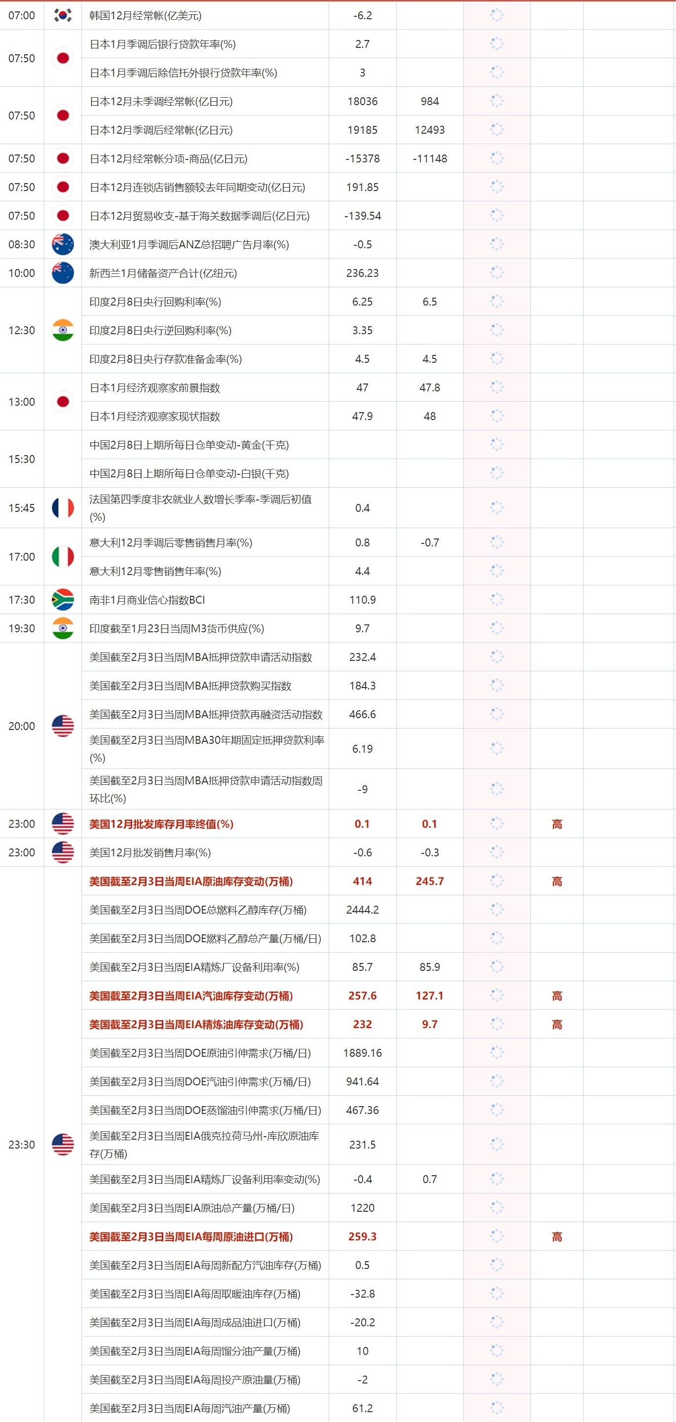 汇通财经APP讯——2月8日,投资者需要关注的重点数据:韩国12月经常帐,美国12月批发库存月率终值,美国12月批发销售月率,美国截至2月3日当周EIA原油库存变动,美国截至2月3日当周EIA汽油库存变动,美国截至2月3日当周EIA精炼油库存变动,美国截至2月3日当周EIA每周原油进口。需要关注的大事件包括纽约联储主席威廉姆斯接受《华尔街日报》的采访;美联储理事丽莎·库克出席一场讨论会;欧洲央行管委诺特发表讲话。