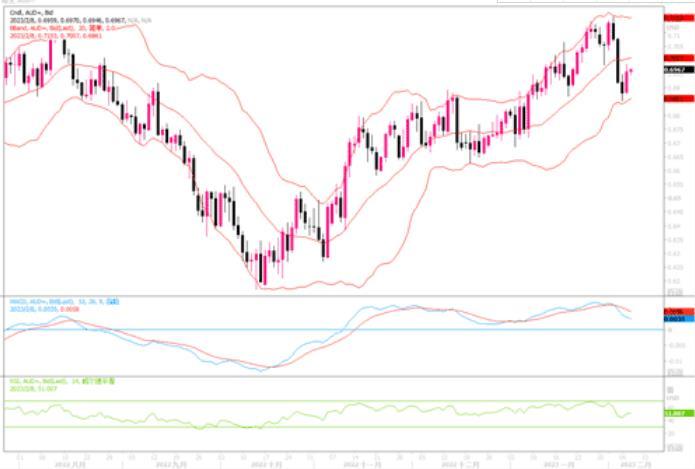澳元周二(2月7日)波动很大,兑美元涨幅一度达到1.15%,至0.6959美元的日内高点。澳洲央行稍早升息25个基点,并重申将可能需要进一步升息--比许多人的预期更为鹰派。澳洲央行这种表态说明,其认为通胀将在较长一段时间内保持高位,打压了今年晚些时候或明年初放松货币政策的看法。4小时图上,澳元兑美元在0.6850附近得到较强的支撑,MACD出现金叉,显见短线或会产生较强的反弹。上方初步阻力在0.70,破位后有望向0.7100冲击。而下方若跌破0.6850,将威胁0.68至0.6725区域的支撑。