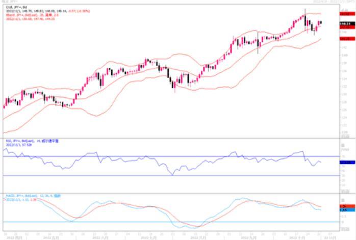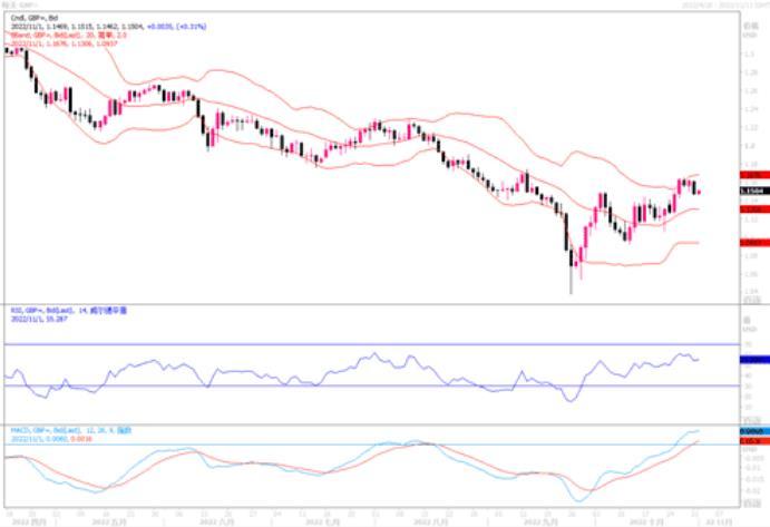 美元走强压制非美货币,英镑周一走势承压,小幅收跌;当天开盘1.1605,收盘1.1469。尽管英国可能将面临经济衰退,且新任首相苏纳克削减开支可能加深经济衰退。但市场预期英国央行周四(11月3日)将会开启第八次会议升息以控制超过10%的通胀,市场认为英国央行11月3日升息75个基点至3%的可能性约为90%。