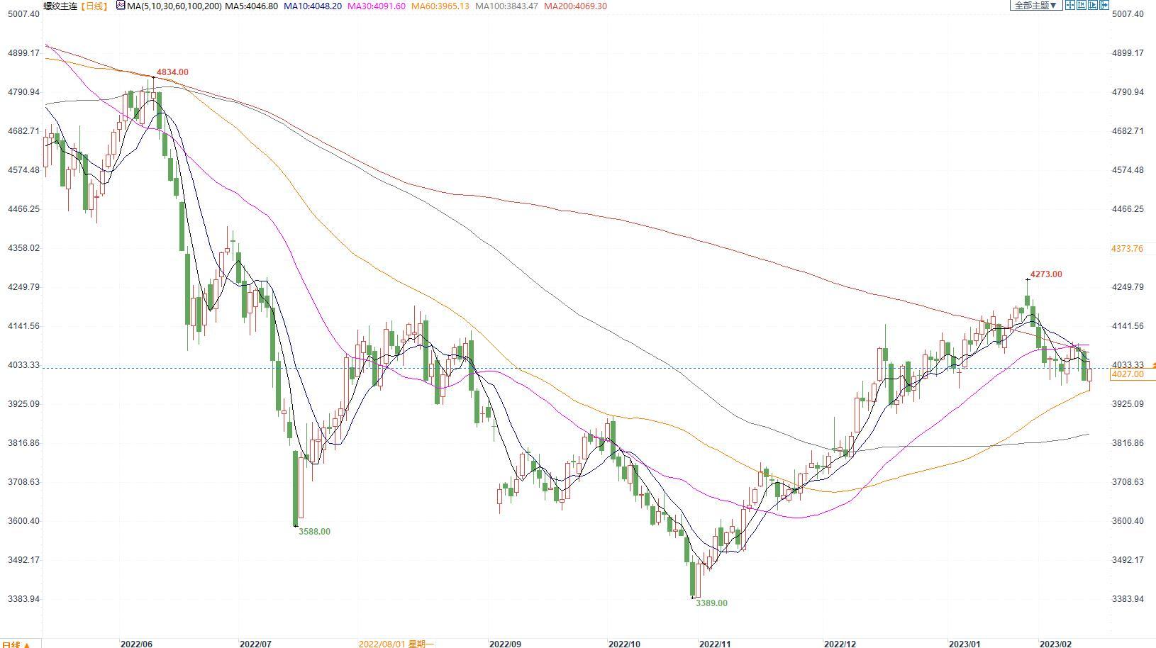价格:螺纹钢2305合约今日白天出现回升,重新回到4000点上方,跌幅明显收窄。收盘价4027元/吨,小幅收跌0.10%。上海中天现货价4110元/吨,较昨日价格暂稳。