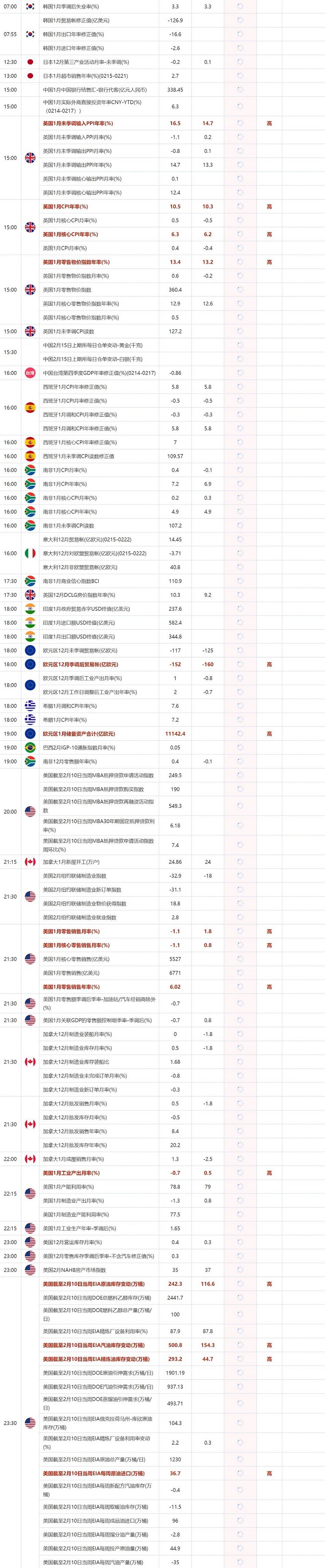 15:00 英国1月核心CPI月率(%) , 前值 0.5 , 预期值 -0.5 , 公布值:待发布
