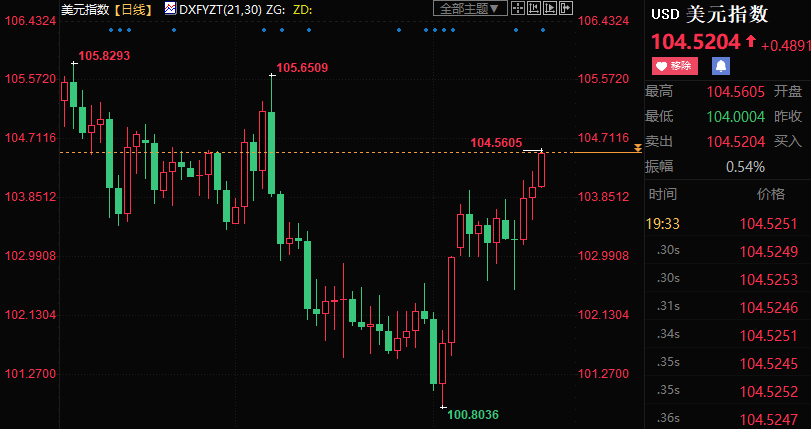 截止发稿,现货黄金下跌2.18%至1824.49美元/盎司;COMEX期金主力合约下跌2.29%至1833.5美元/盎司;美元指数上涨0.93%至104.533。