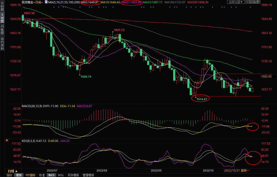 日线级别:震荡;均线接近空头排列,KDJ初步死叉,顶破5日均线1649.57前,后市略微偏向空头,初步支撑在日内低点1630.53附近,如果失守该支撑,则金价料将再度试探9月低点1614.67附近支撑,进一步较强的支撑在1600关口附近。