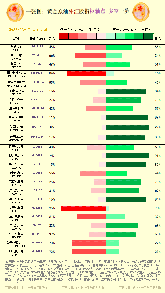 汇通财经APP讯——一张图:黄金原油外汇股指"枢纽点+多空占比"一览。今日(2023/02/17周五)最新出炉的数据显示,截止上个交易日结束时,头寸达到80%及以上的品种有:★ 富时中国A50 ☆FTSE China A50多头占比高达84%。标普500指数 S&P 500空头占比高达84%。英国富时100 FTSE 100空头占比高达89%。德国DAX40 GERMANY 40空头占比高达83%。欧元兑英镑 EUR/GBP空头占比高达91%。欧元兑日元 EUR/JPY空头占比高达85%。美元兑加元 USD/CAD空头占比高达84%。美元兑瑞郎 USD/CHF多头占比高达95%。汇通网提醒,更多详见本文图表。仅供参考,不作为交易依据。