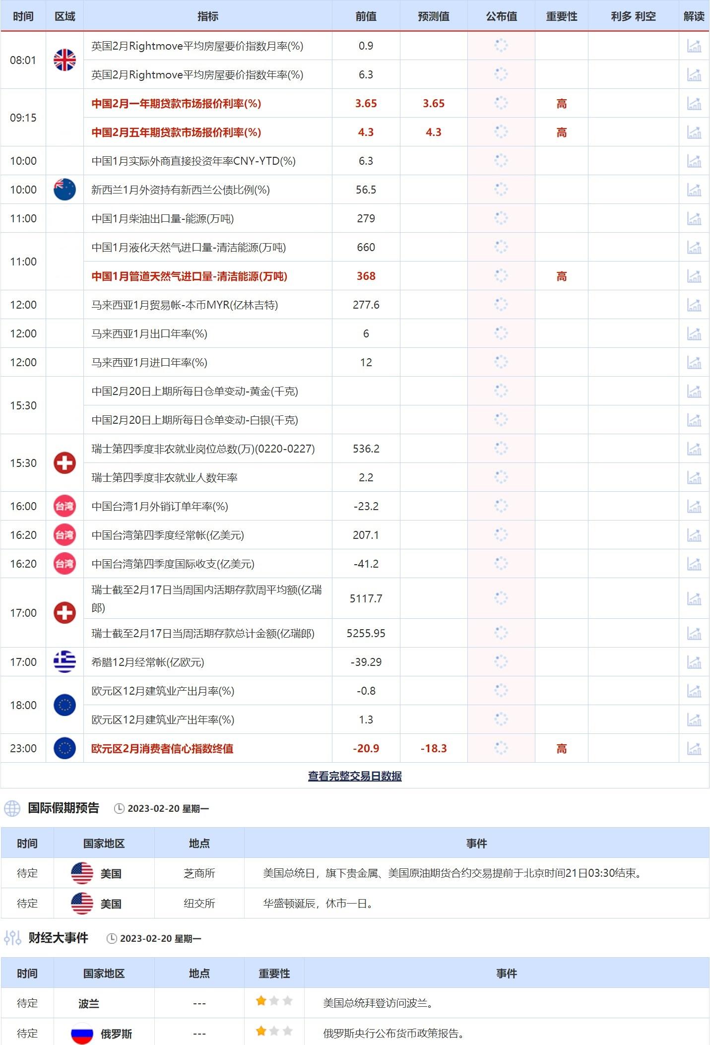 汇通财经APP讯——2月20日,投资者需要关注的重点数据:中国2月一年期贷款市场报价利率,中国2月五年期贷款市场报价利率,欧元区12月建筑业产出月率,欧元区12月建筑业产出年率和欧元区2月消费者信心指数终值。需要关注的大事件包括俄罗斯央行公布货币政策报告; 美国芝商所因美国总统日,旗下贵金属、美国原油期货合约交易提前于北京时间21日03:30结束;美国纽交所因华盛顿诞辰,休市一日。