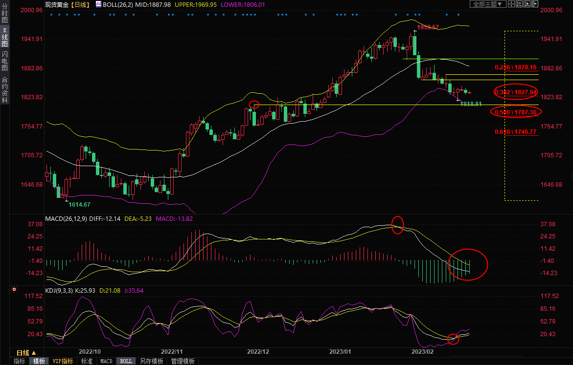 日线级别:震荡下跌;过去两个交易日金价波动较小,技术面信号变化不大,MACD死叉且下穿零轴,布林带继续开口,金价后市偏向沿布林线下轨向下运行,短线继续留意1827.94附近支撑,该位置是1615-1960涨势的38.2%回撤位,若收盘于该位置下方,则增加短线看空信号,中线可能进一步跌向50%回撤位1787.36附近。