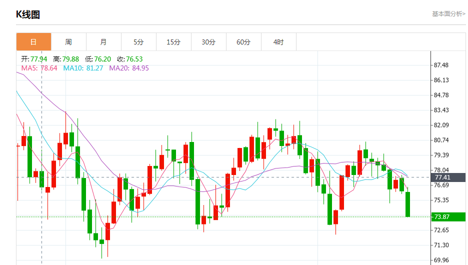 商品收盘情况:布伦特原油期货结算价急跌3%,报每桶80.60美元。美国原油期货重挫3%,结算价报每桶74.05美元,美国期金收低0.1%,报每盎司1841.50美元。