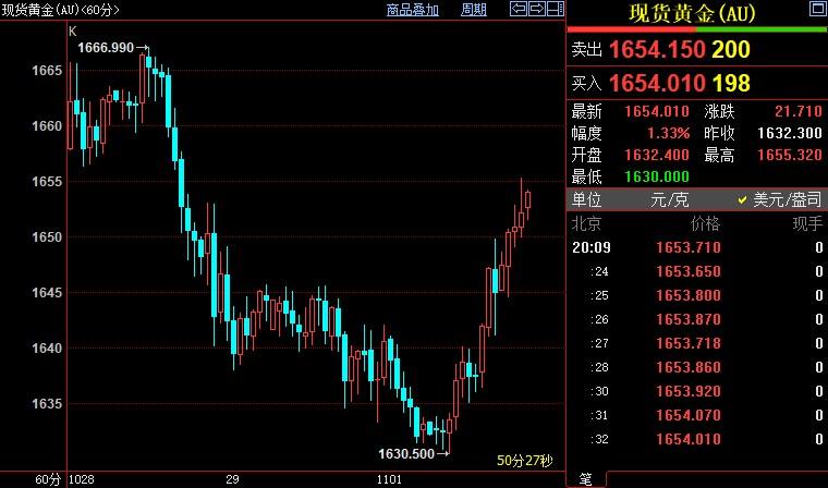 北京时间20:08,现货黄金上涨1.20%至1653.08美元/盎司;COMEX期金主力合约上涨0.95%至1656.4美元/盎司;美元指数下跌0.66%至110.847;10年期美债收益率下跌13个基点至3.949%。