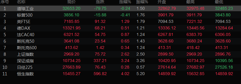 美股收盘情况:道琼斯工业指数下跌0.24%,至32653.2点;标普500指数下跌0.41%,至3856.1点;纳斯达克指数下跌0.89%,至10890.85点。